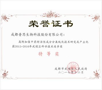 2017年 普思的科技項目“高附加值中藥成分分離純化技術(shù)研究及產(chǎn)業(yè)化”榮獲武侯區2015-2016年度科技進(jìn)步特等獎;