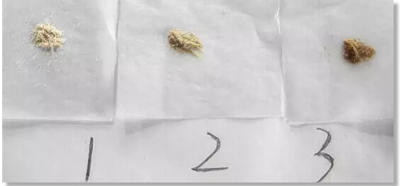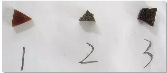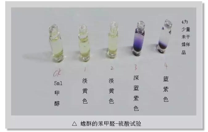 按傳統蟾酥鑒別法,若遇水起泡沫則是蟾酥正品,則可初步推斷樣品2是偽品,樣品1、3疑似正品,為了進(jìn)一步證明推斷是否正確,來(lái)試試顯色法。
