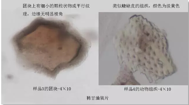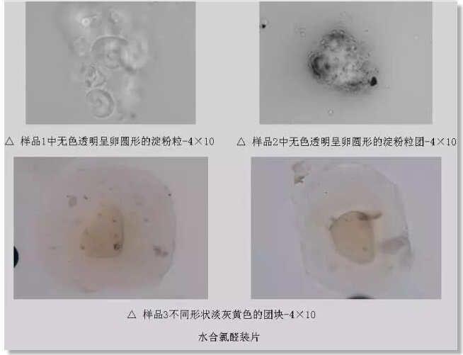 與在樣品4中發(fā)現的動(dòng)物組織相比,更令我驚訝的是在樣品1、2中發(fā)現了淀粉顆粒,不過(guò)這無(wú)色透明呈卵圓形的淀粉??粗?zhù)還蠻晶瑩剔透的,只是可惜了都是偽品吶,要知道蟾酥很貴的好不,不要什么淀粉、泥砂、牙膏、肥皂都拿來(lái)充次好嗎?