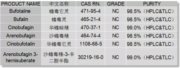 可見(jiàn),鑒別藥材真偽是一件非常麻煩的事,而蟾酥就更麻煩了,那么多摻偽品,不對我已備好小妙招,給你們推薦了系列用于檢測蟾酥的對照品,見(jiàn)圖吧。