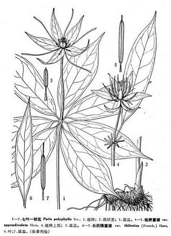 1.七葉一枝花,多年生草本,高30-2500px。莖直立。葉5-8片輪生于莖頂,葉片披針形、倒卵狀披針形或倒披針形,長(cháng)7-425px.寬2.5-125px?;ü那o頂抽出,通常比葉長(cháng),頂生一花,萼片4-6,葉狀,綠色,長(cháng)3-175px;花被片細線(xiàn)形,黃色或黃綠色,寬1-1.5mm。長(cháng)為萼片的1/3至近等長(cháng);雄蕊8-10,花藥長(cháng)1.2-50px。蒴果球形?;ㄆ?/span>5-7月,果期8-10月。生于山坡林下蔭處或溝谷邊的草叢陰濕處。