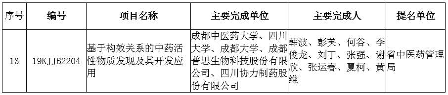 由四川省中醫藥局提名,我司作為主要完成單位之一申報的“基于構效關(guān)系的中藥活性物質(zhì)發(fā)現及其開(kāi)發(fā)應用”項目獲四川省科學(xué)技術(shù)進(jìn)步獎(科技進(jìn)步類(lèi))一等獎,公司董事長(cháng)兼總經(jīng)理劉丁先生、原副總經(jīng)理夏柯先生是項目的主要完成人。項目的主要完成單位還有成都中醫藥大學(xué)、四川大學(xué)、成都大學(xué)和四川協(xié)力制藥股份有限公司。