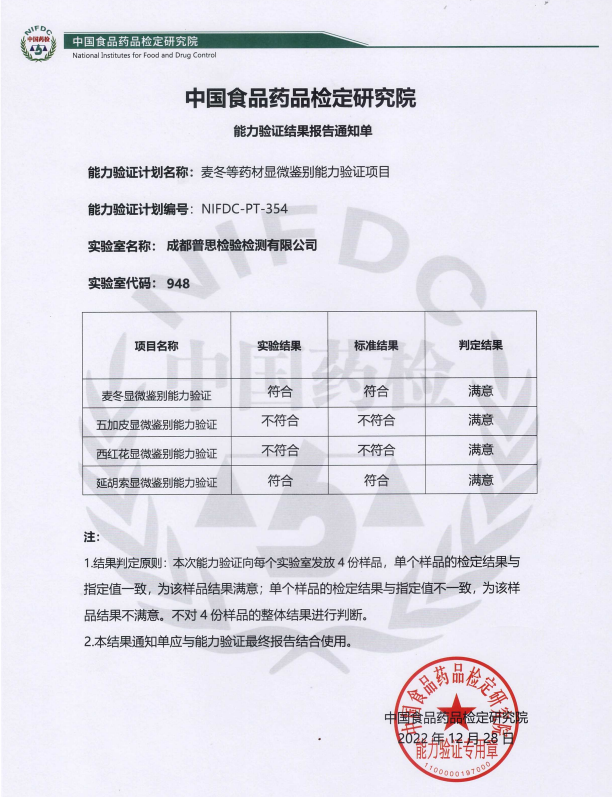 普思生物順利通過(guò)中檢院藥材顯微鑒別和含量測定兩項能力驗證