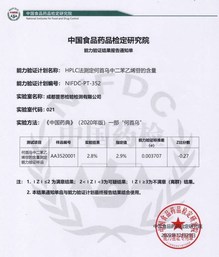 近日,成都普思生物科技股份有限公司旗下子公司“成都普思檢驗檢測有公司”通過(guò)了由中檢院于2022年組織的“麥冬等藥材顯微鑒別能力驗證項目”、“HPLC法測定何首烏中二苯乙烯苷的含量”兩項能力驗證,結果均為“滿(mǎn)意”。
