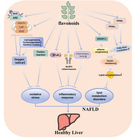 雖然NAFLD是一種肝臟相關(guān)疾病,但心血管疾病和惡性腫瘤是NAFLD患者死亡的主要原因,這意味著(zhù)NAFLD的治療需要整體治療。研究發(fā)現黃酮類(lèi)化合物能夠通過(guò)改善氧化應激、脂質(zhì)代謝和全身炎癥來(lái)減輕NAFLD的進(jìn)程。