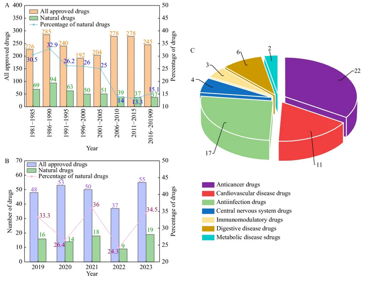 (B) 2019年至2023年FDA批準的所有藥物中天然藥物的百分比