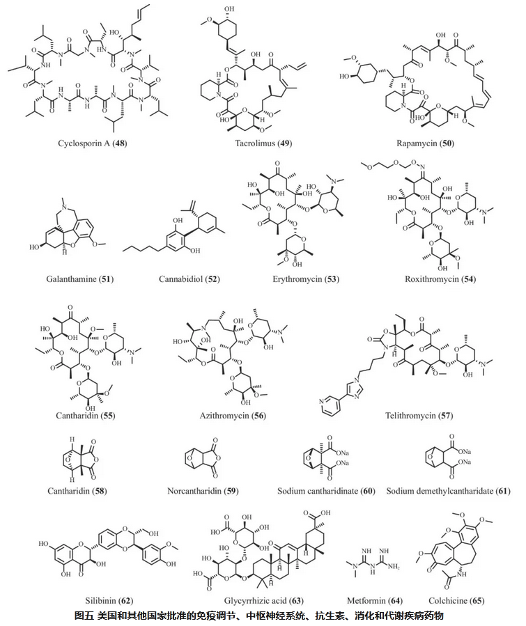 根據各種疾病的臨床治療需求,本綜述介紹了65種具有代表性的藥物,這些藥物或直接來(lái)源于天然產(chǎn)物,或來(lái)源于天然產(chǎn)物的衍生物。這些藥物已獲得國家醫藥產(chǎn)品管理局(NMDA)、美國食品藥品監督管理局(FDA)、歐洲藥品管理局和日本藥品醫療器械管理局等監管機構的批準。在這些藥物中,有29種是在中國開(kāi)發(fā)的,其余36種是在國際上獲得批準的。