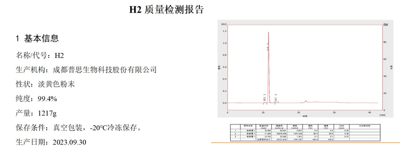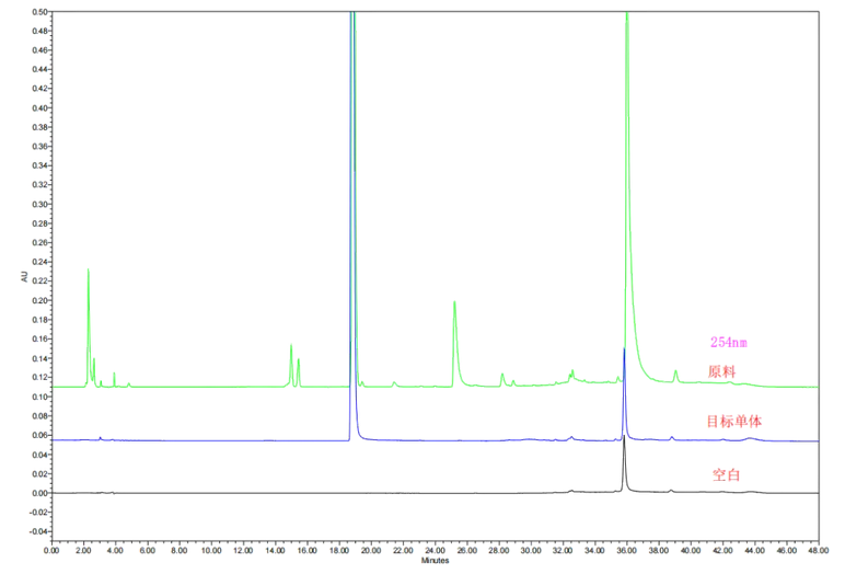某護膚品企業(yè)需從某珍稀植物中提取含量?jì)H0.01%的抗氧化黃酮成分。普思生物利用半制備系統開(kāi)發(fā)專(zhuān)屬方法,實(shí)現微量成分的高效富集,最終獲得100mg超高純度(99.4%)單體,助力客戶(hù)產(chǎn)品功效升級。原料及單體HPLC圖譜: