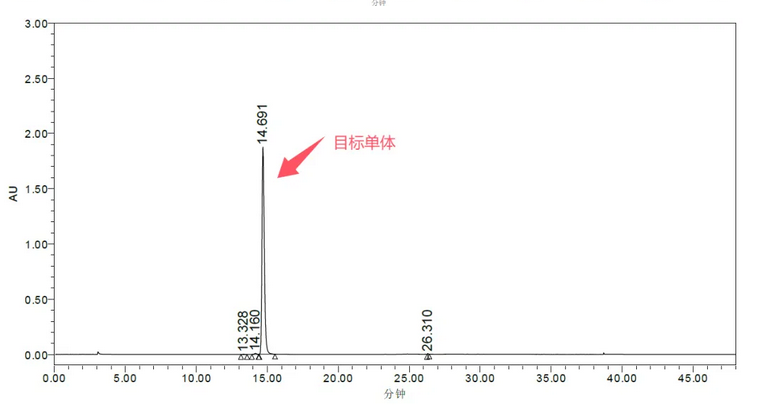 制備液相優(yōu)化:選用內徑150mm系統,梯度洗脫結合動(dòng)態(tài)軸向壓縮柱技術(shù),單批次處理量達50g原料,獲得目標成分120g,純度99.2%(HPLC圖譜見(jiàn)下圖)原料及單體分離圖譜:
