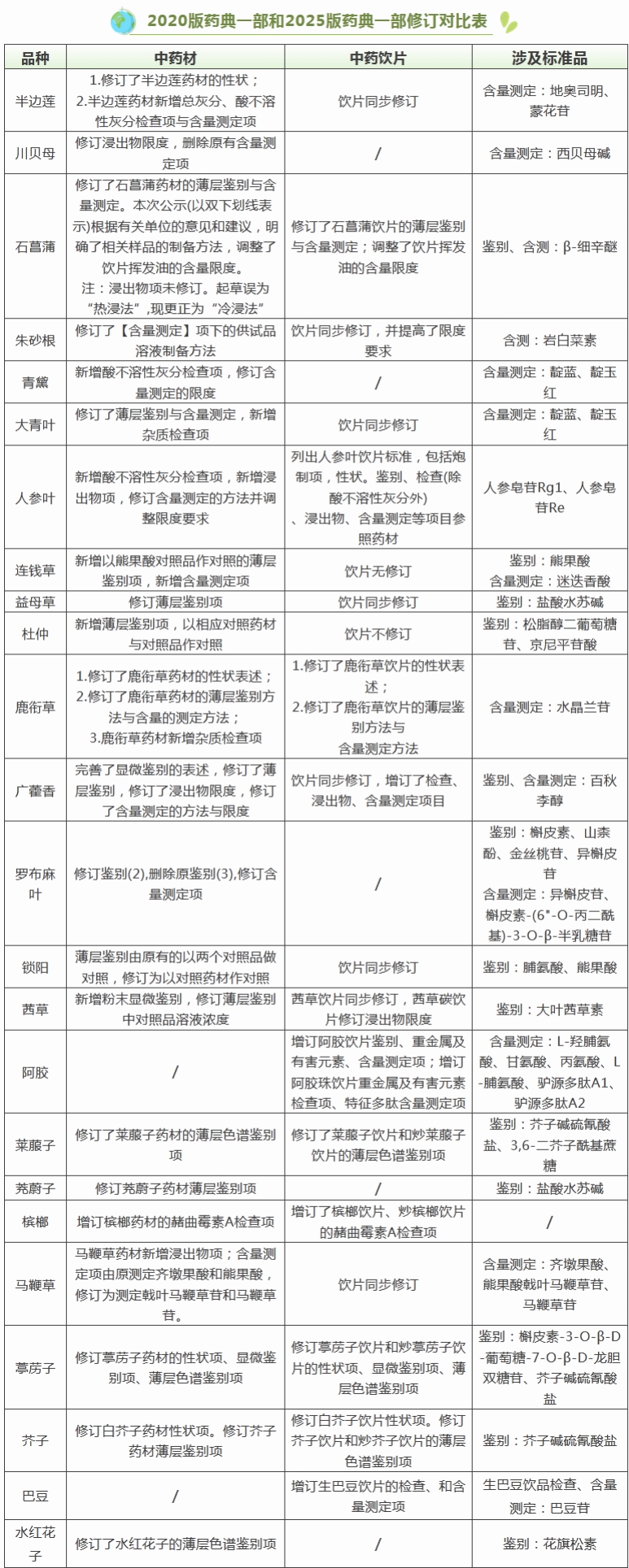 2025版藥典一部對比2020版藥典一部增修訂情況