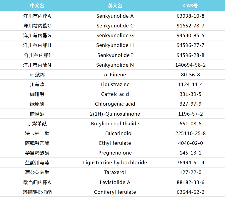 目前我司共有多種川芎活性成分,其中洋川芎內酯C是普思生物新研的稀有化合物,洋川芎內酯A和C相較于藥材中其他成分含量低但仍能發(fā)揮出優(yōu)良的抗炎活性,減輕各類(lèi)疾病中的炎癥反應,還可作用相應靶點(diǎn)表現鎮痛功效,故可作為川芎的指標性成分。