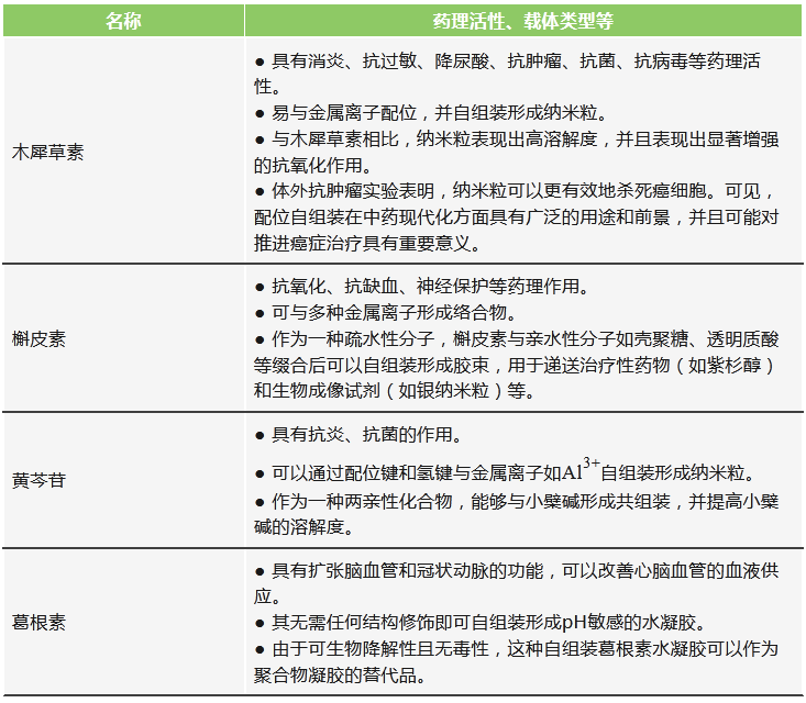 (1)一些中藥活性成分具備通過(guò)自組裝形成“自遞藥系統”的能力,可以充分利用其自身性質(zhì)形成遞送系統,實(shí)現“藥輔合一”。