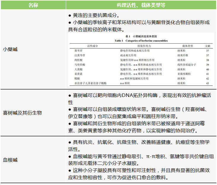 生物堿在許多中藥中廣泛存在,大多數有復雜的環(huán)狀結構,且含有N元素,呈現堿的性質(zhì)。生物堿是植物在應對環(huán)境脅迫時(shí)產(chǎn)生的次生代謝產(chǎn)物,往往具有一定的毒性。在藥理方面,其表現為抗病毒、抗菌的活性。生物堿可以與多種中藥活性成分共組裝,以其自身作為藥物和載體作為藥物和載體,從而發(fā)揮更強的藥效。