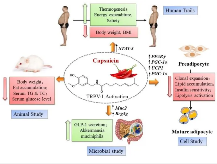 5. 抗肥胖作用:辣椒素已被證明可以抑制脂肪生成和促進(jìn)脂肪細胞中的脂質(zhì)氧化,通過(guò)作用于胃饑餓素調節下丘腦飽腹感和抑制食欲;通過(guò)上調UCP2和UCP3抑制體重增加;通過(guò)調節腸道菌群來(lái)增強產(chǎn)熱和維持代謝穩態(tài)(圖二)。