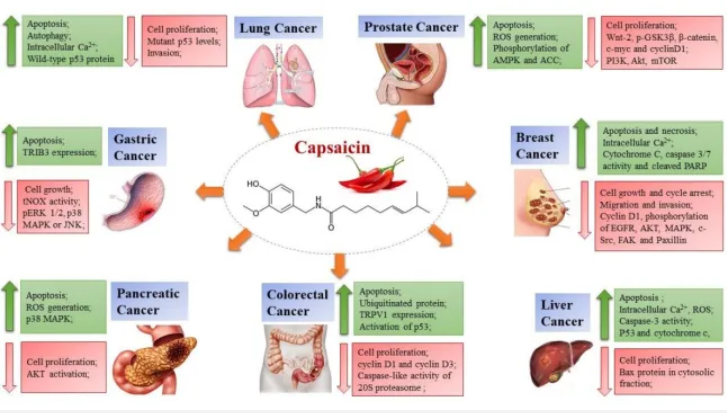 4.抗癌作用:多項研究表明,辣椒素可以調節參與癌細胞增殖、細胞周期阻滯、信號轉導、凋亡和轉移的基因和酶的表達水平,具有顯著(zhù)的抗腫瘤活性,對胃癌、乳腺癌、肺癌、前列腺癌、結直腸癌、胰腺癌等多種類(lèi)型的人類(lèi)癌癥均有較強的抗癌作用(圖一)。