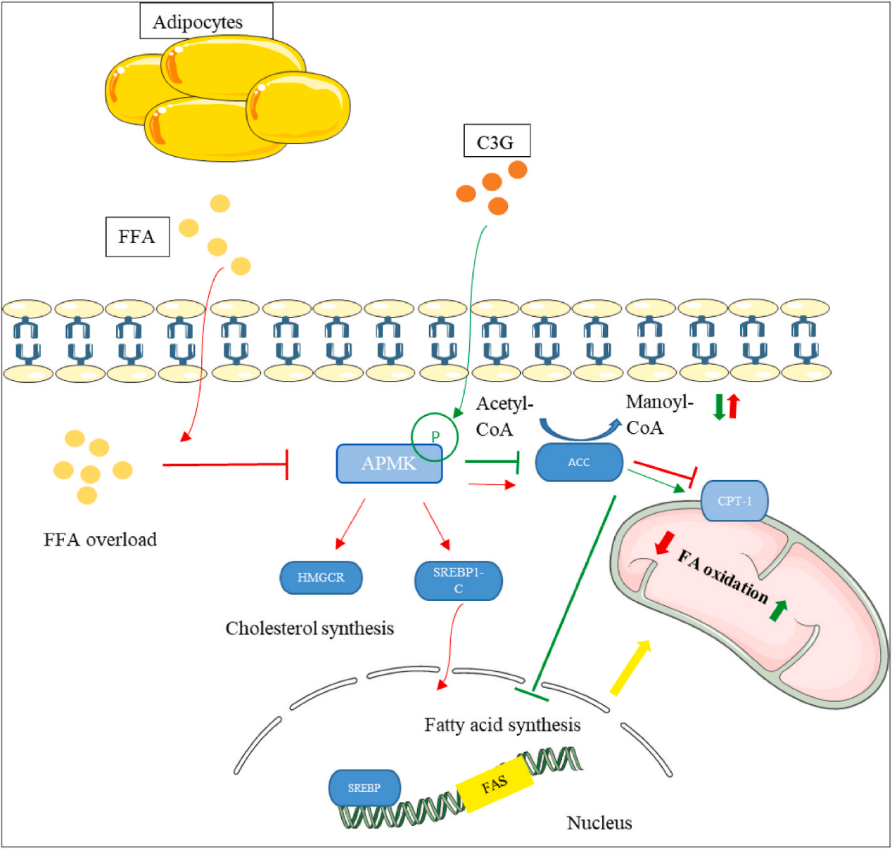 圖4 矢車(chē)菊素-3-O-葡萄糖苷(C3G)調控脂質(zhì)代謝示意圖[9]