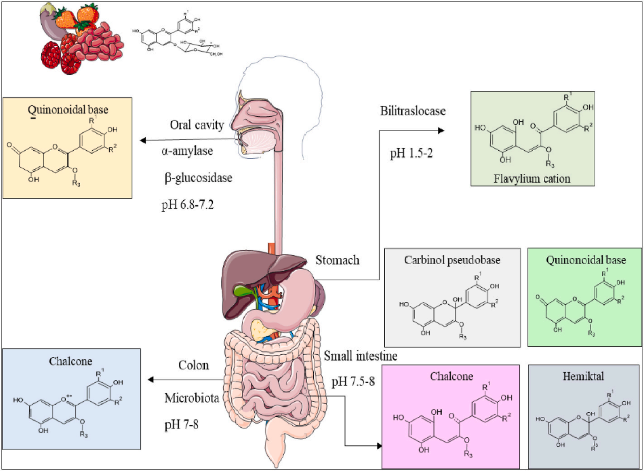 圖5 矢車(chē)菊素-3-O-葡萄糖苷(C3G)在人體胃腸道不同部位的降解和吸收示意圖[9]