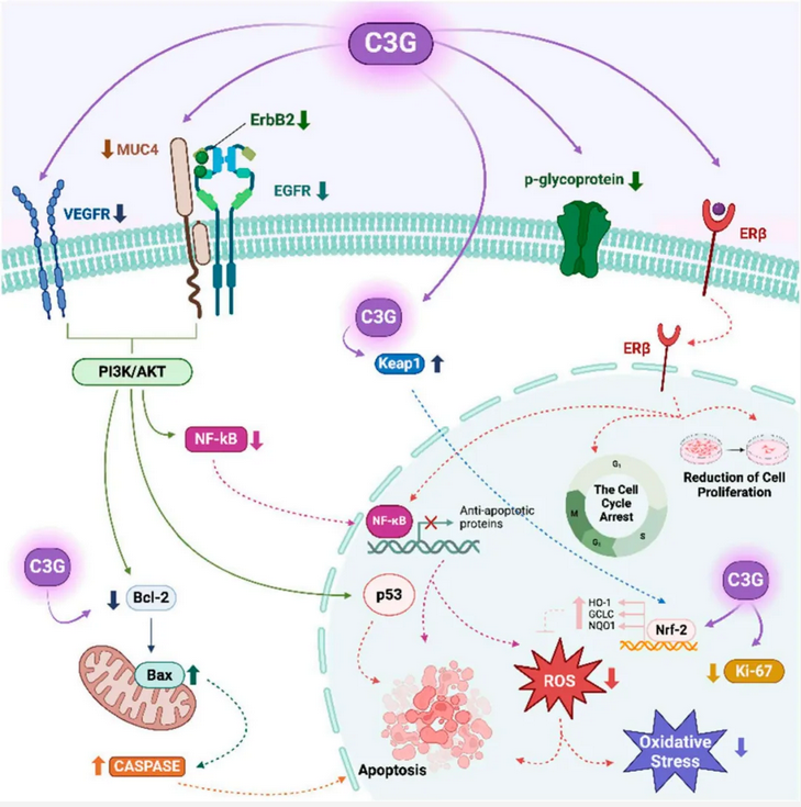 C3G對女性生殖健康有益,能保護卵巢細胞免受氧化應激,抑制卵巢癌和宮頸癌細胞生長(cháng),并可能緩解多囊卵巢綜合征(PCOS)。