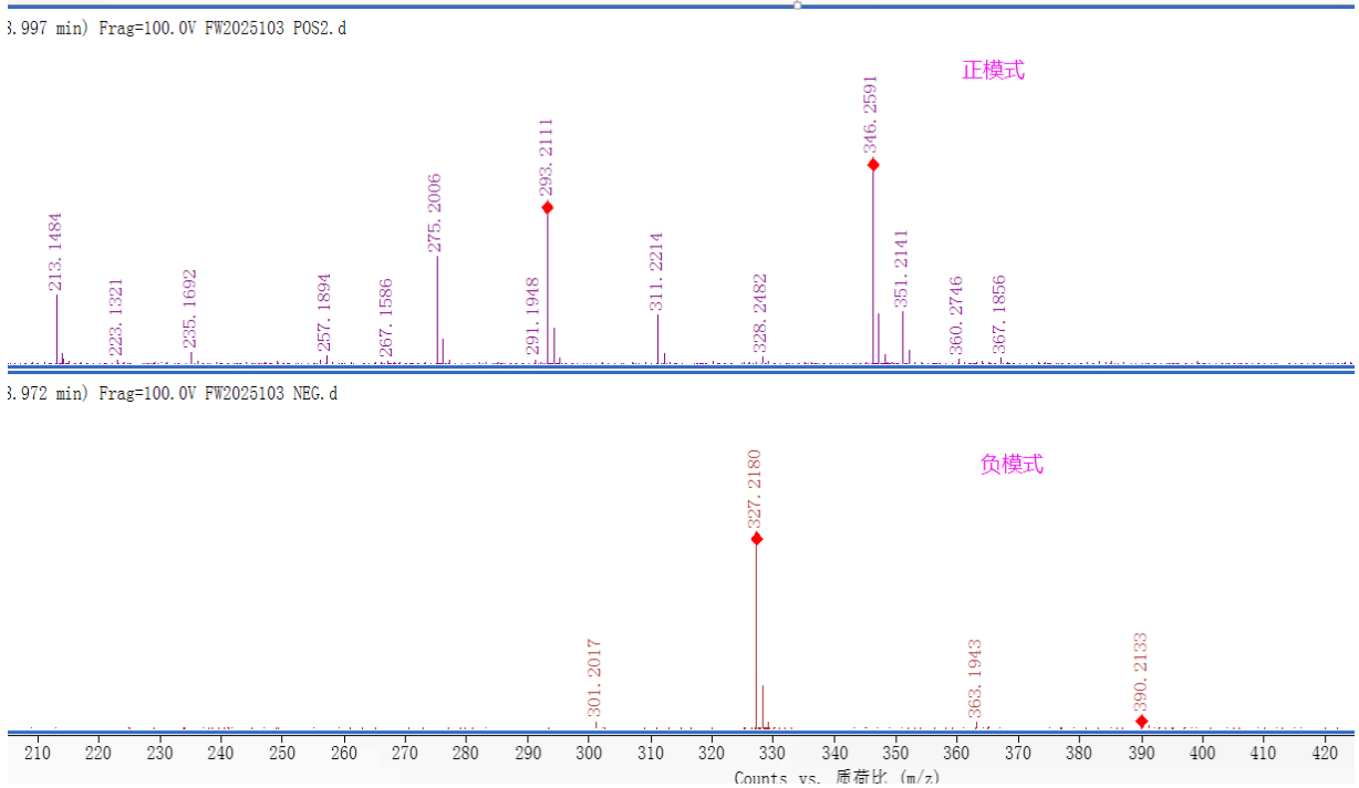 分子量預測過(guò)程中,最容易導致誤判的是圖中出現的看似“相關(guān)”的干擾離子,如[M+NH4]+與[M]+,[M-H2O+H]+與[M +H]+都是間隔18。如下圖中,275與293,328與346均間隔18,單正模式,無(wú)法確定分子量為292還是328。但結合負模式可確定為328。