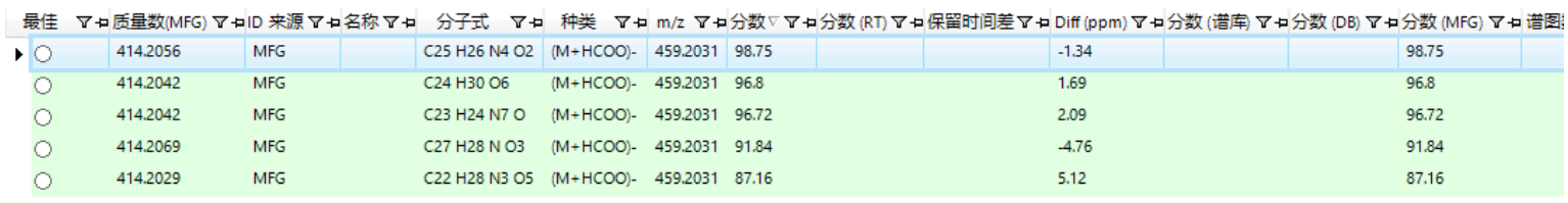 對于軟件擬合的分子式,可通過(guò)“N規則”、天然產(chǎn)物常見(jiàn)元素、擬合的質(zhì)量偏差、擬合分數等進(jìn)行進(jìn)一步縮小范圍,獲得最可能的分子式結果,以獲得更準確結果。